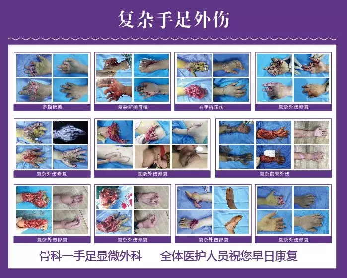 手足部各类开放性、闭合性拉伤、手足部骨关节拉伤、手足部肌腱损伤、四肢周围神经拉伤、断肢及断指再植术、手足部******、手足部瘢痕、手足部感染、手足部先天畸形、手足部肿瘤及肿物、手足部康复******。